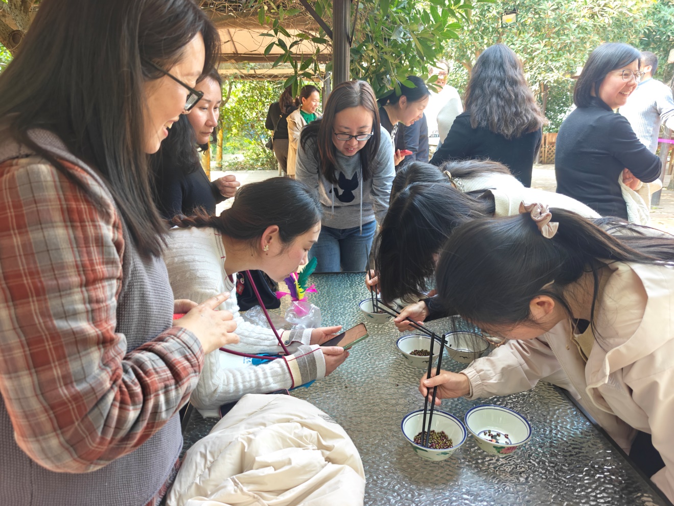 活动当天,教职工们结伴漫步,欣赏春日美景,卸下工作的疲惫,畅谈生活点滴。午饭后,学院精心设置了“跳绳、踢毽子、颠羽毛球、夹弹珠、分拣红豆和绿豆”等多项兼具趣味性与互动性的休闲项目,贴合教职工日常作息,兼顾运动性与趣味性。