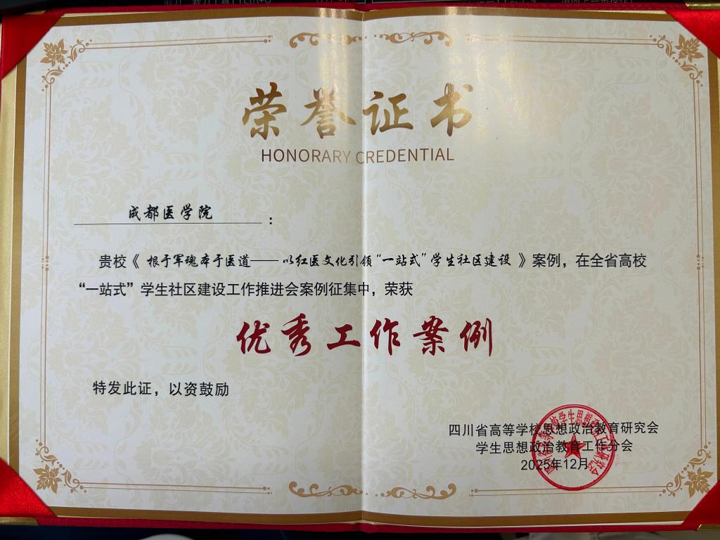 12月26日,全省高校“一站式”学生社区建设工作推进会召开。会上,四川省高等学校思想政治教育研究会学生思想政治教育工作分会正式公布了案例征集评选结果。我校报送的《根于军魂 本于医道——以红医文化引领“一站式”学生社区建设》案例,在全省众多参评案例中脱颖而出,荣获“优秀工作案例”。